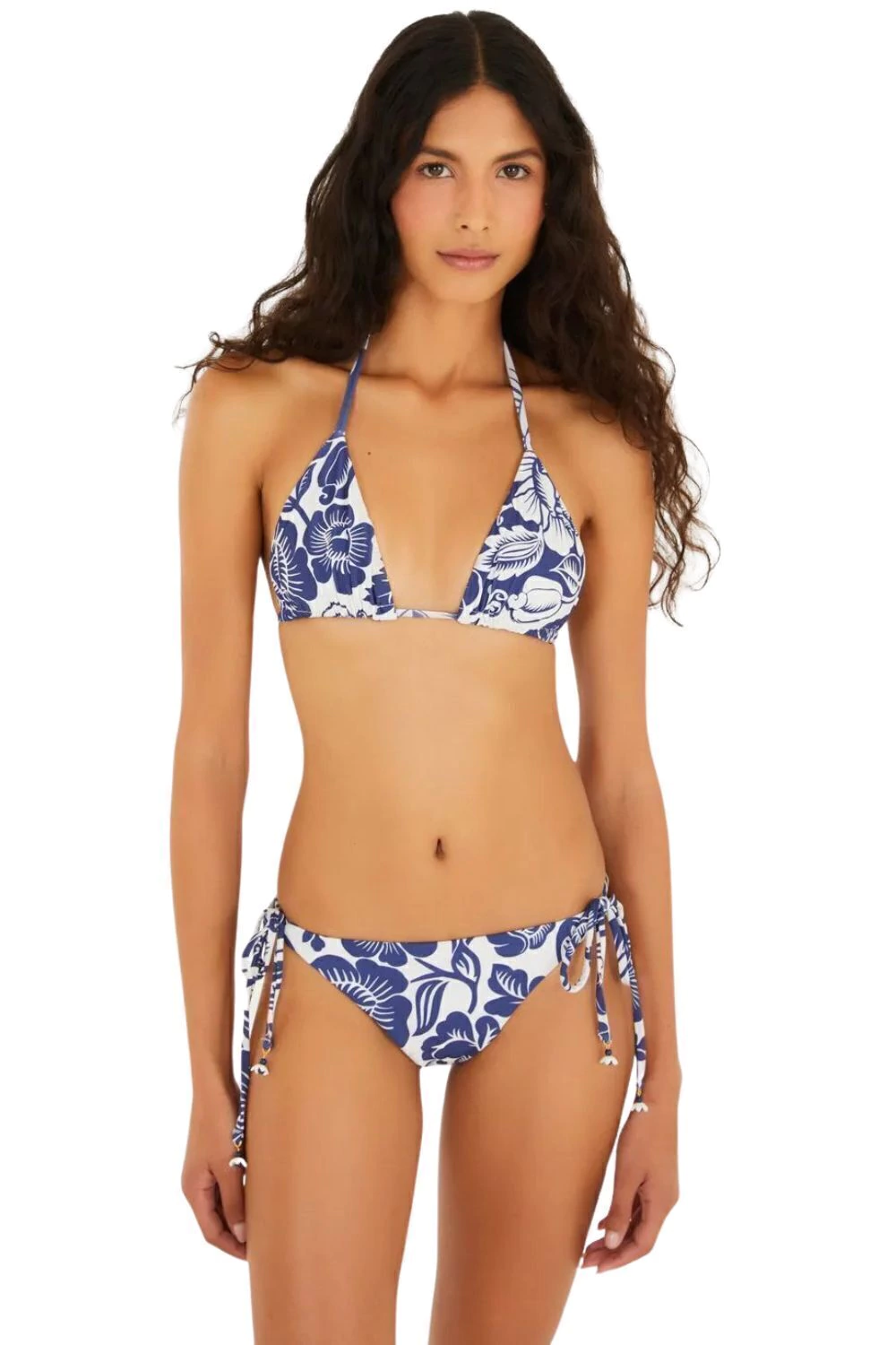 O biquíni azul é confeccionado em malha de poliamida com alta elasticidade.