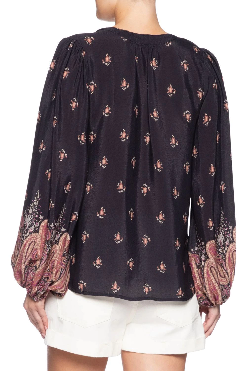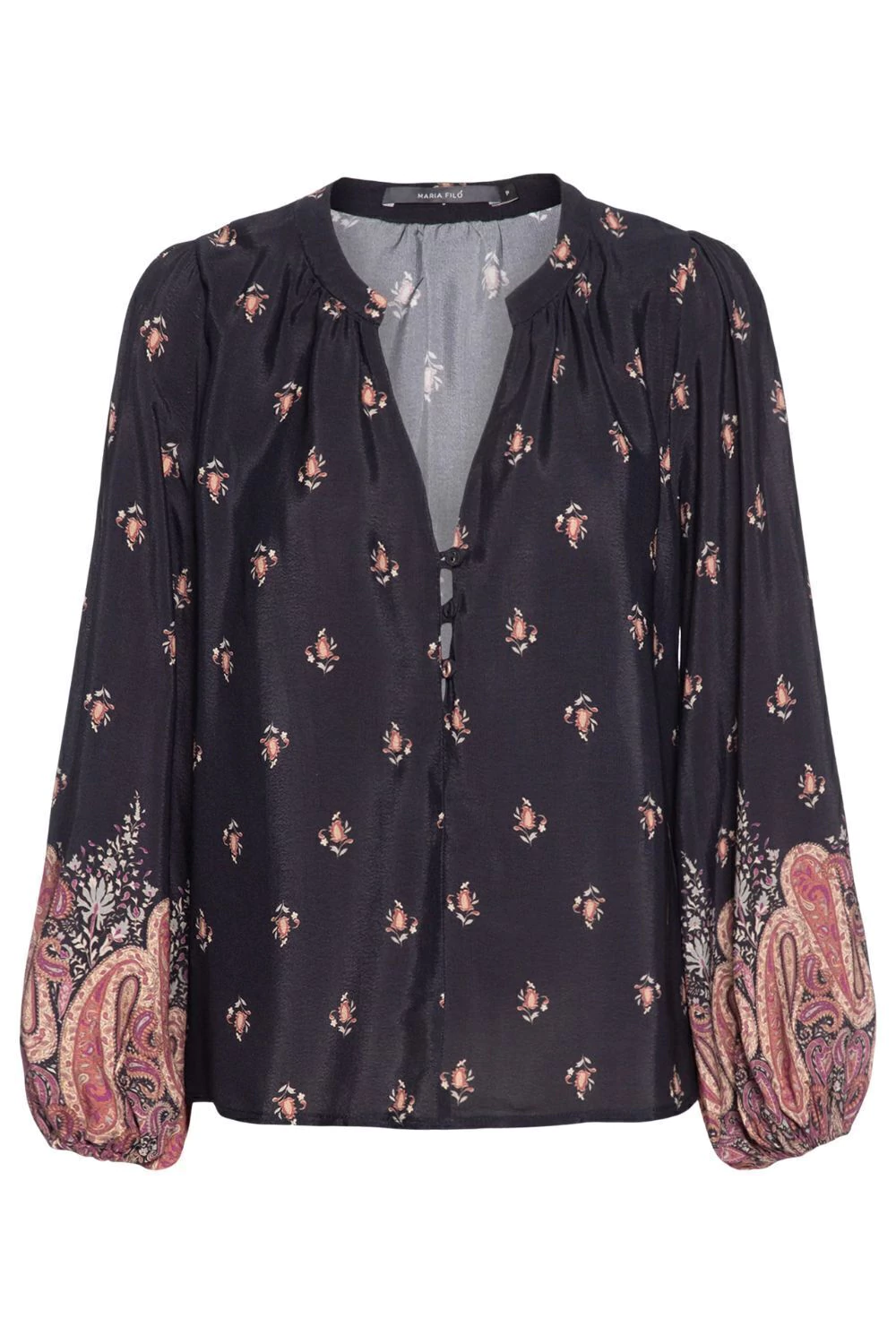 A blusa azul marinho é confeccionada em tecido leve sem elasticidade. A peça solta ao corpo possui decote V, mangas longas com ajuste nos punhos, mix de estampas em cores contrastantes e fechamento frontal por botões.