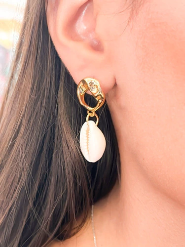 O brinco, com base orgânica e ouro na composição do banho e pingente de búzios naturais.