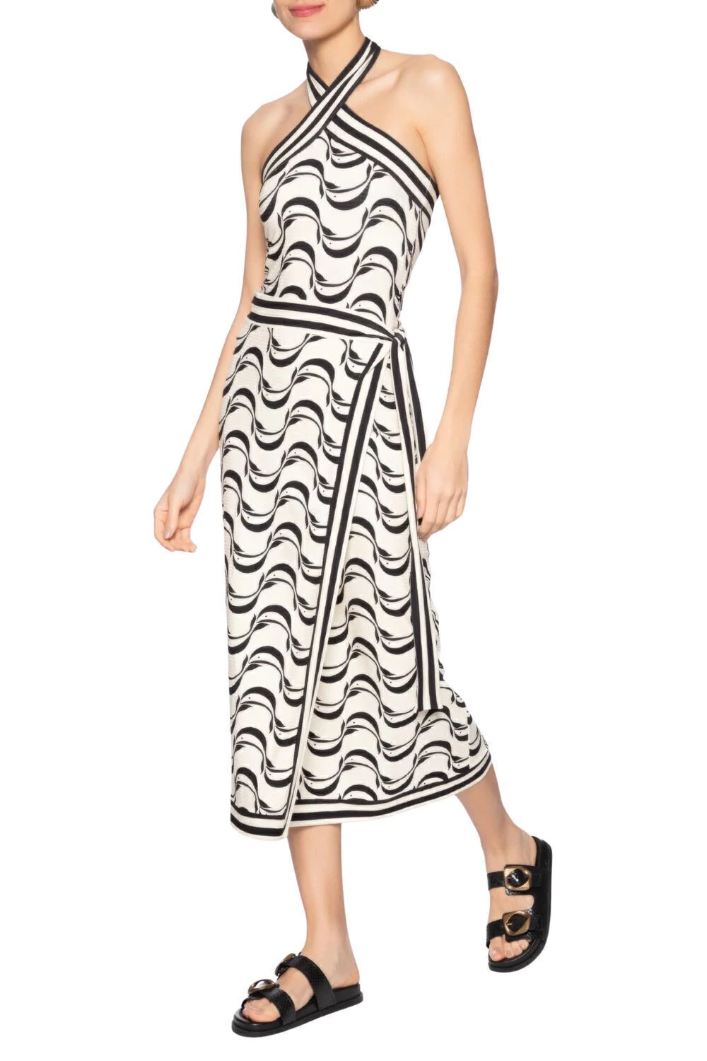 A peça solta ao corpo possui cintura alta, cós com tira alongada para amarração, estampas de peixes em cor contrastante e comprimento midi.