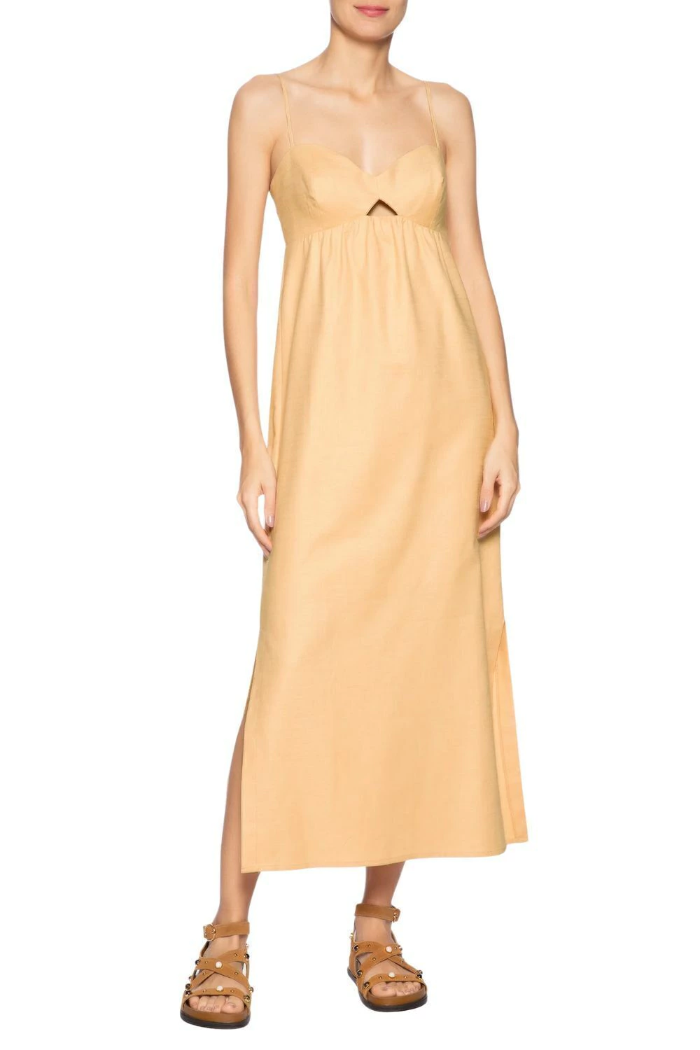 O vestido amarelo é confeccionado tecido leve sem elasticidade.
