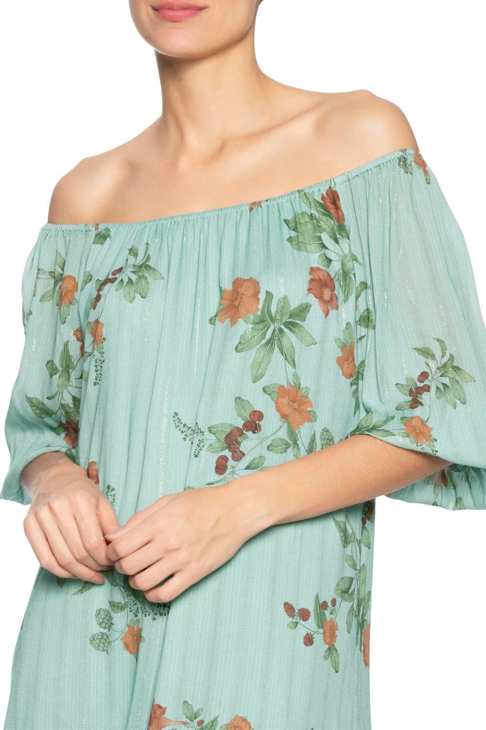A peça solta ao corpo possui decote ombro a ombro com elástico embutido, mangas 3/4 com elástico embutido na barra, forro, estampa floral em cores contrastantes, forro e comprimento midi.